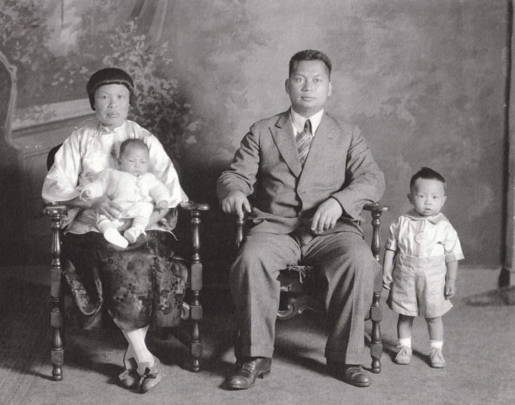 This image was take in Red Bluff. Pictured is Lee, Mee Gum with son, Arthur Fong, husband Jimmy Gum You Fong and son Edward Fong. After the Conard family sold the Tremont Hotel to the Forward family October of 1945, the restaurant was changed from American cuisines to French, thus leaving many in the Chinese community unemployed and forcing the Fong family to relocate to Colusa and then to 10th and W Street, Sacramento, California.