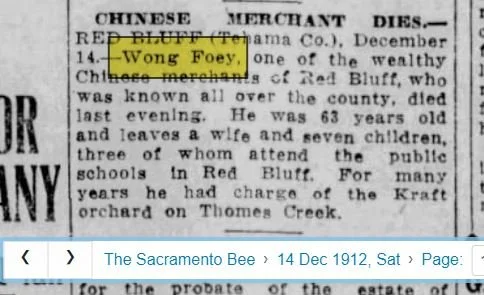 黄德純Wong, Foey born April 1849 was a champion of the people living in Tehama County. Referred to as the Mayor Chinatown, his efforts would delay the precipitous decline of Chinese American residents from leaving Tehama County for at least two generations. He had a Cantonese funeral, celebrating his life with rituals at his store, the family hired a procession band from San Francisco and whalers to mourn while walking in the hearse from Chinatown to Oak Hill Cemetery.
